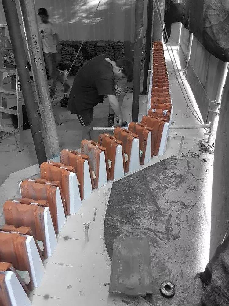 每一塊瓷磚都是根據(jù)其功能來放置的,這些模型是最終設(shè)計(jì)的基礎(chǔ)。尖形瓦片由于其強(qiáng)度放在底部,遮蓋了堅(jiān)固的拱肩。使用等邊瓦片在視平線上減少視覺障礙。在頂部使用斜面瓦片,因?yàn)樗目障陡?,并且向北傾斜。瓦片的變化可以隱藏瓦片的邊緣,從而減少結(jié)構(gòu)負(fù)荷對(duì)建筑的影響。