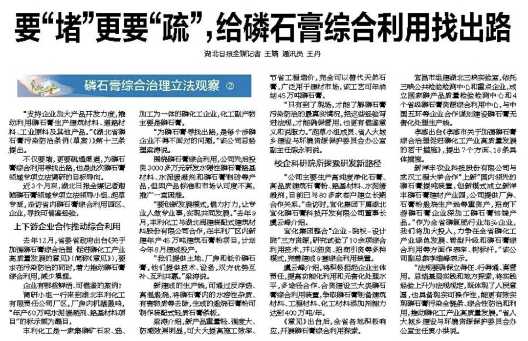 我省磷礦資源豐富,也是磷石膏產(chǎn)生大省。去年12月,省委省政府出臺(tái)《關(guān)于加強(qiáng)磷石膏綜合治理 促進(jìn)磷化工產(chǎn)業(yè)高質(zhì)量發(fā)展的意見》。發(fā)揮人大立法主導(dǎo)作用,省人大常委會(huì)啟動(dòng)立法快速反應(yīng)機(jī)制,將磷石膏領(lǐng)域綜合立法納入2022年度重點(diǎn)工作項(xiàng)目,通過制定地方性法規(guī),推動(dòng)意見落實(shí)。湖北日?qǐng)?bào)開設(shè)“磷石膏綜合治理立法觀察”專欄,探尋立法背后的故事。