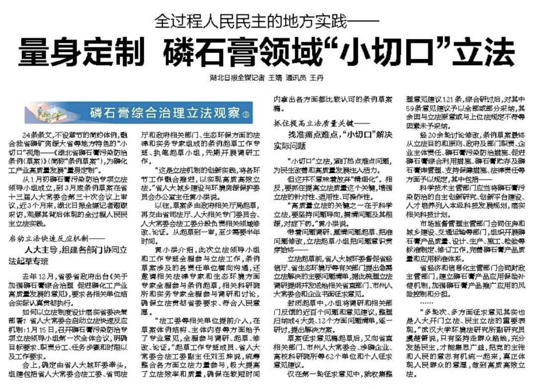 從1月初磷石膏污染防治專項(xiàng)立法領(lǐng)導(dǎo)小組成立,到3月底條例草案在省十三屆人大常委會(huì)第三十次會(huì)議上審議,近3個(gè)月來,湖北日報(bào)全媒記者跟蹤采訪,觀察其背后體現(xiàn)的全過程人民民主立法實(shí)踐。