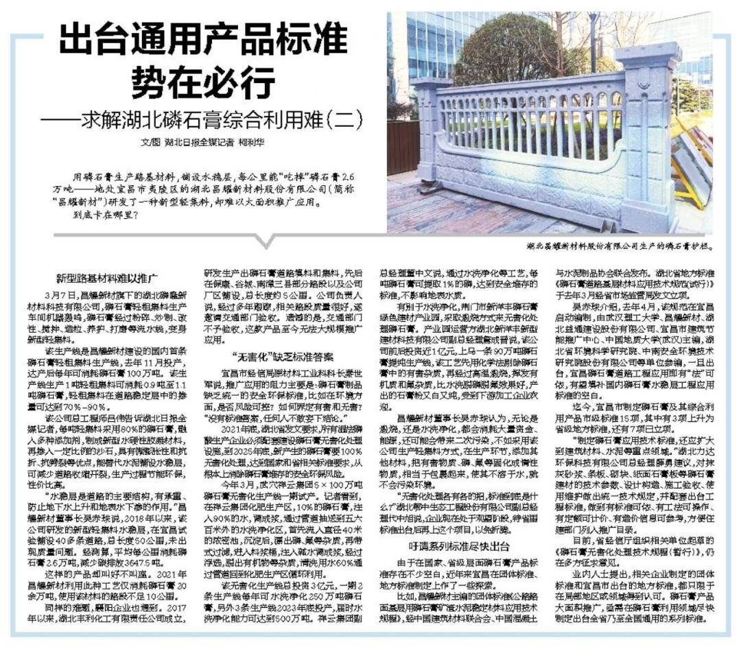 比如,昌耀新材主編的團(tuán)體標(biāo)準(zhǔn)《公路路面基層用磷石膏礦渣水泥穩(wěn)定材料應(yīng)用技術(shù)規(guī)程》,經(jīng)中國(guó)建筑材料聯(lián)合會(huì)、中國(guó)混凝土與水泥制品協(xié)會(huì)聯(lián)合發(fā)布。湖北省地方標(biāo)準(zhǔn)《磷石膏道路基層材料應(yīng)用技術(shù)規(guī)范(試行)》于去年3月經(jīng)省市場(chǎng)監(jiān)管局發(fā)文立項(xiàng)。