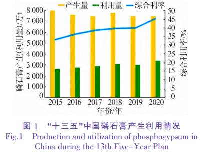 十三五”期間中國磷石膏綜合利用水平有了較為明顯的提升(見圖 1),綜合利用率由期初的33.3%。增長至期末的 45.3%,增長 12%,超額完成“十三五”既定目標(biāo);利用量由期初的 2 650 萬 t/a 增長至期末的 3 400 萬 t/a,增幅 28.3%,年均遞增 5.11%。
