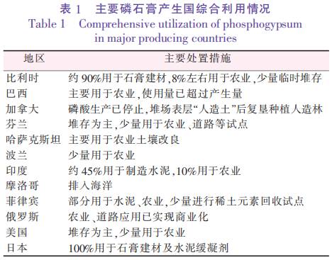 根據(jù)國際肥料協(xié)會(huì)(IFA)2020 年發(fā)布的“引導(dǎo)創(chuàng)新 合作:磷石膏管理和使用核心原則”報(bào)告可知, 目前世界主要磷石膏產(chǎn)生國的磷石膏綜合利用途徑主要在農(nóng)業(yè)、建筑、道路三大領(lǐng)域,由于各個(gè)國家的國情不同,利用的側(cè)重方向有所區(qū)別(見表 1)。