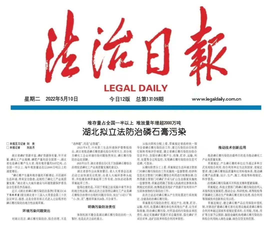 3月底,《湖北省磷石膏污染防治條例(草案)》(以下簡(jiǎn)稱(chēng)草案)提交湖北省十三屆人大常委會(huì)第三十次會(huì)議審議。據(jù)悉,這是全國(guó)首部正式進(jìn)入立法程序的磷石膏污染防治地方性法規(guī)草案。