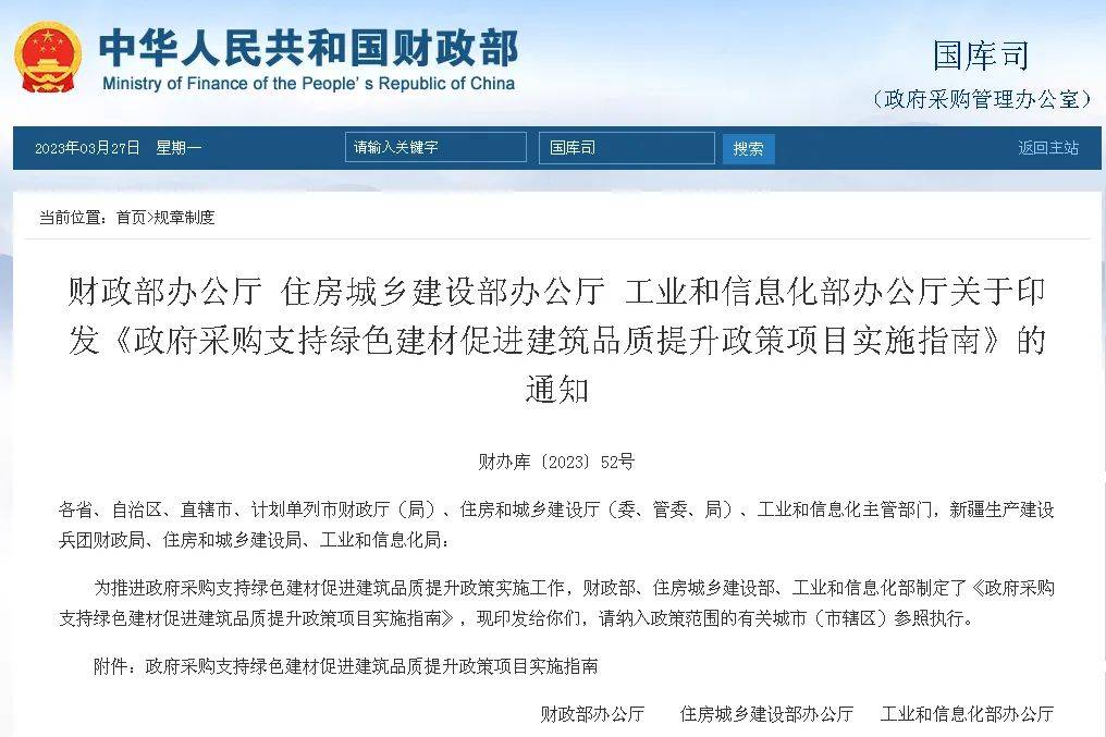 近日,財(cái)政部辦公廳、住房和城鄉(xiāng)建設(shè)部辦公廳、工業(yè)和信息化部辦公廳聯(lián)合印發(fā)了《政府采購支持綠色建材促進(jìn)建筑品質(zhì)提升政策項(xiàng)目實(shí)施指南》(以下簡稱《指南》),推進(jìn)政府采購支持綠色建材、促進(jìn)建筑品質(zhì)提升政策實(shí)施工作。