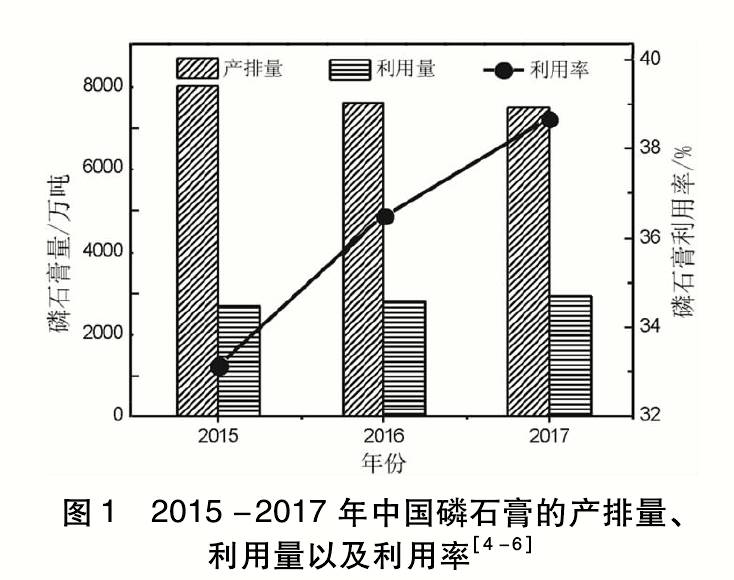 中國(guó)的磷石膏主要集中分布在云南、湖北、貴州、四川、安徽五省的磷礦富集區(qū),據(jù) 2015年數(shù)據(jù)統(tǒng)計(jì),五省的磷石膏產(chǎn)排量占全國(guó)產(chǎn)排總量 的87.4%。2015-2017年磷石膏的產(chǎn)排量、利用量以及利用率見(jiàn)圖 1。近幾年,磷石膏的產(chǎn)排量在逐年減少,利用量與利用率在逐年穩(wěn)步升高。在2017年,磷石膏的產(chǎn)排量降至7500萬(wàn)t,利用量升至2900萬(wàn) t,利用率達(dá)38.67%,同比提高約2個(gè)百分點(diǎn)。但是磷石膏年度產(chǎn)排量與利用量之間的差距依然較大,使得堆存量逐年繼續(xù)增多,磷石膏治理和利用的壓力不斷增大。