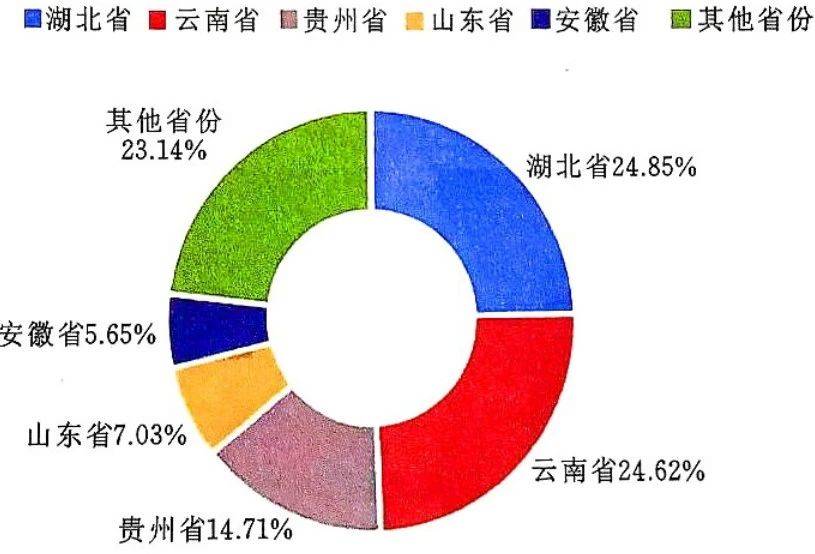 據(jù)統(tǒng)計(jì),2022 年國(guó)內(nèi)磷石膏堆存量已超過7億t,主要分布在湖北、云南、貴州、山東和安徽5個(gè)省份,占比超過 75%。
